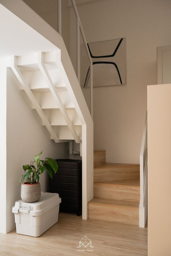 他們連樓梯都不馬虎!原本的設計師有計算一個高度,結果他們告訴我說這樣太陡了,走起來會很累,他們重新計算了階高與階數,做出一個走起來完全不卡腳的轉折梯,爬上爬下超順~而且有注意到視覺也不能太壓迫,整體設計又穩又美