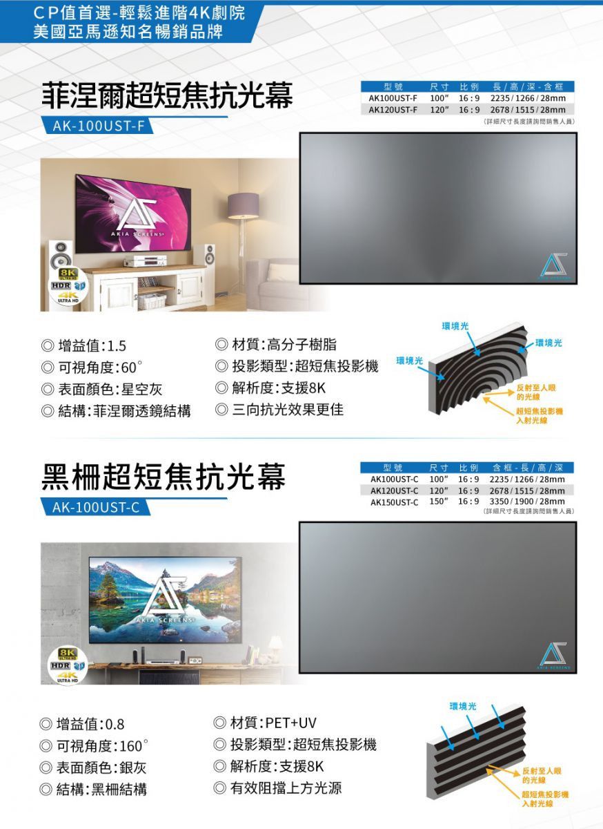 美國Elite Screens100吋16:9 FALR6超短焦菲涅爾高亮抗光軟幕 AR100H-FALR6